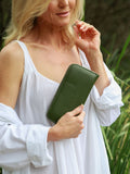 Crafted from the finest cactus leather in deep forest green, La Luna is soft to touch, yet durable and sturdy. Featuring an easy to access front compartment with magnetic-snap closure, opening to a spacious interior with central dividers to easily store and organise your essentials for any occasion. The La Luna also features a small zipper pocket on the back for easy access to your keys, card or headphones.